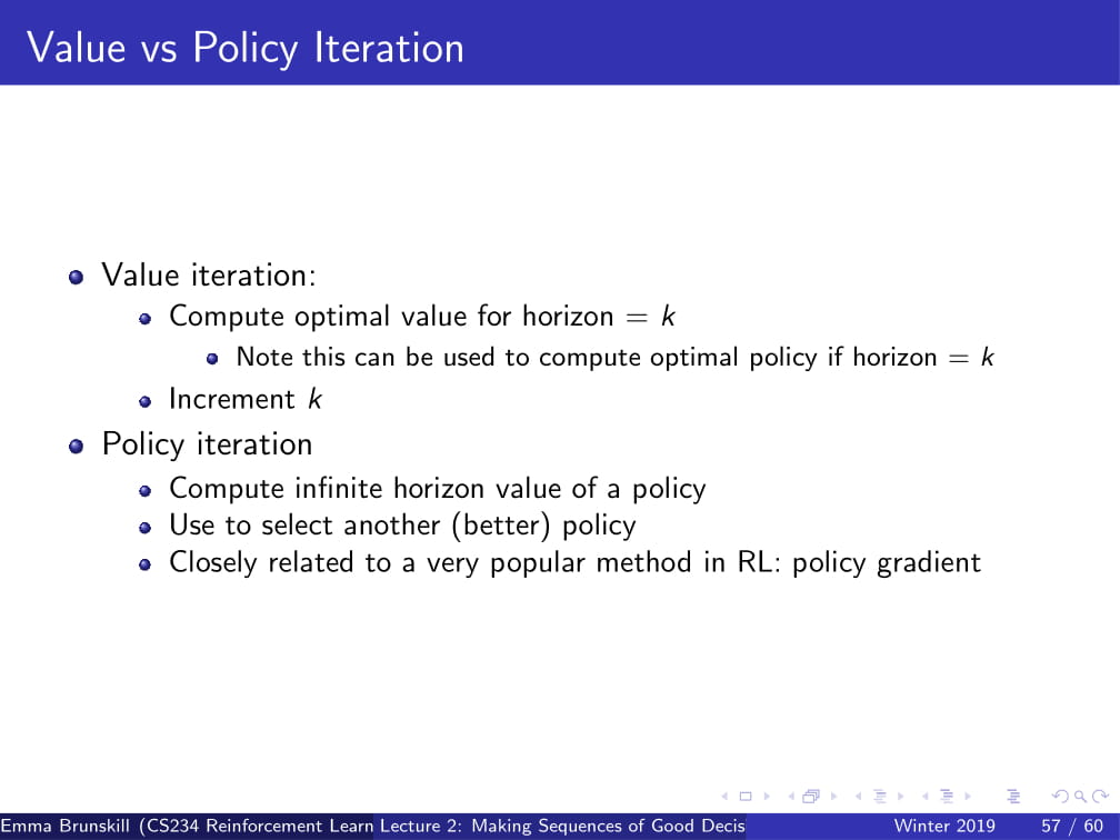 Value Iteration은 time step (horizon) = k일 때의 optimal value를 찾아가며 k를 증가시키는 형식이고,
