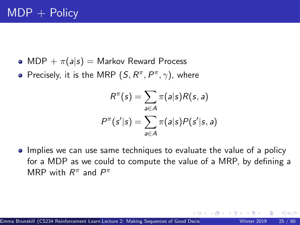 그리고, MDP + π(a|s)는 Markov Reward Process 로 유도할 수 있다.