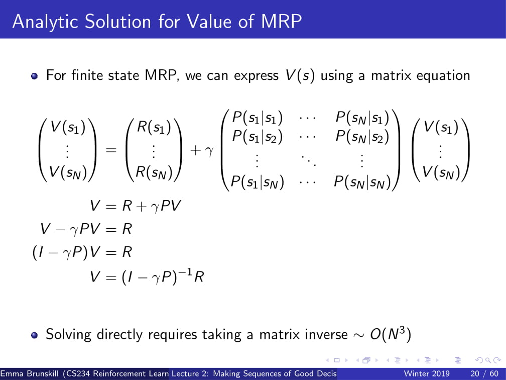 finite state MRP의 경우, V(s)를 Matrix 연산으로 표현 가능한데,