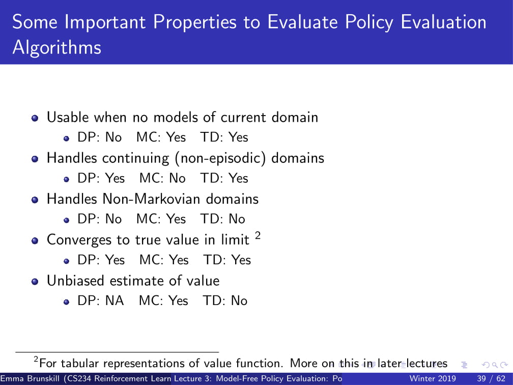 그리고, MC, TD 등의 알고리즘을 선택할 때 Bias/variance, Data efficiency, Computational efficiency와 같은 점들을 고려해야 한다.