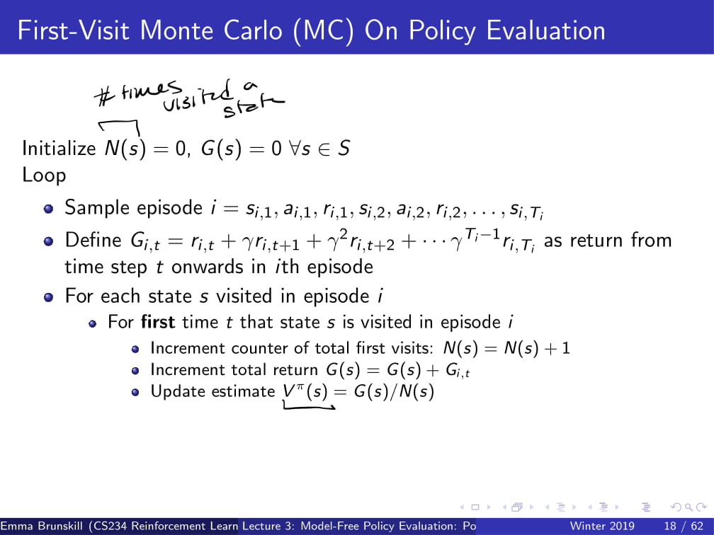 First-Visit Monte Carlo란, 처음 방문한 state의 경우에만 V를 update하는 방식이다.