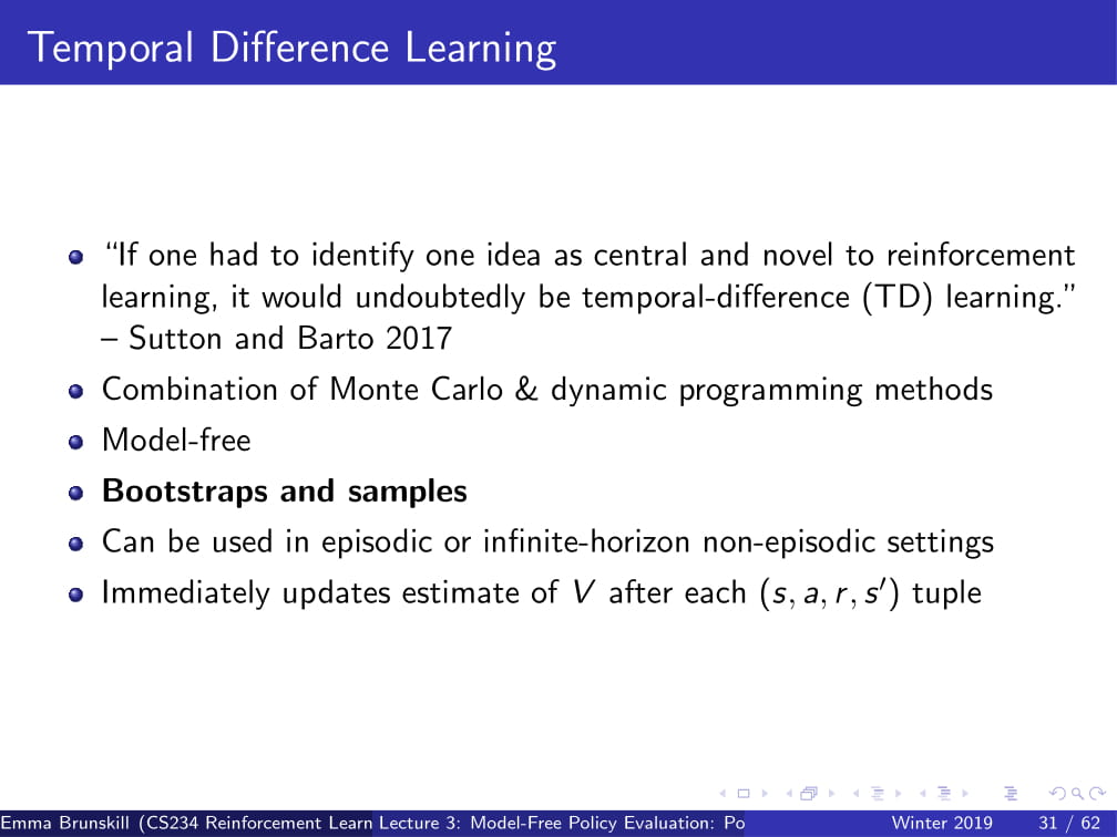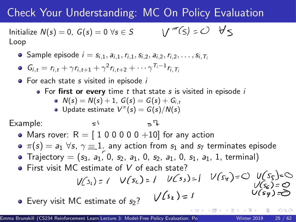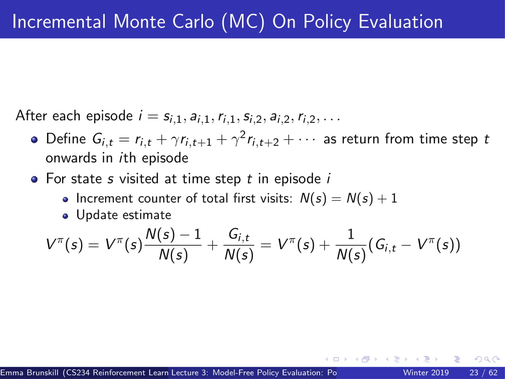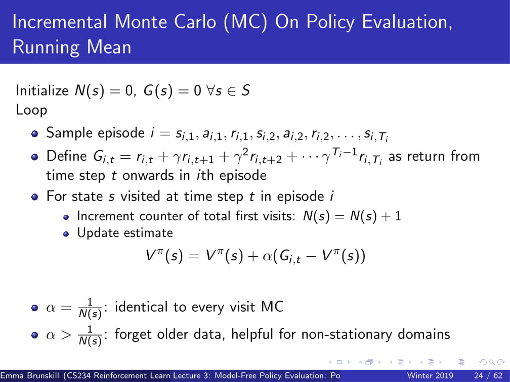강화 학습 강의 (CS234) 3강 - Model-Free Policy Evaluation (Monte Carlo / Temporal Difference)
