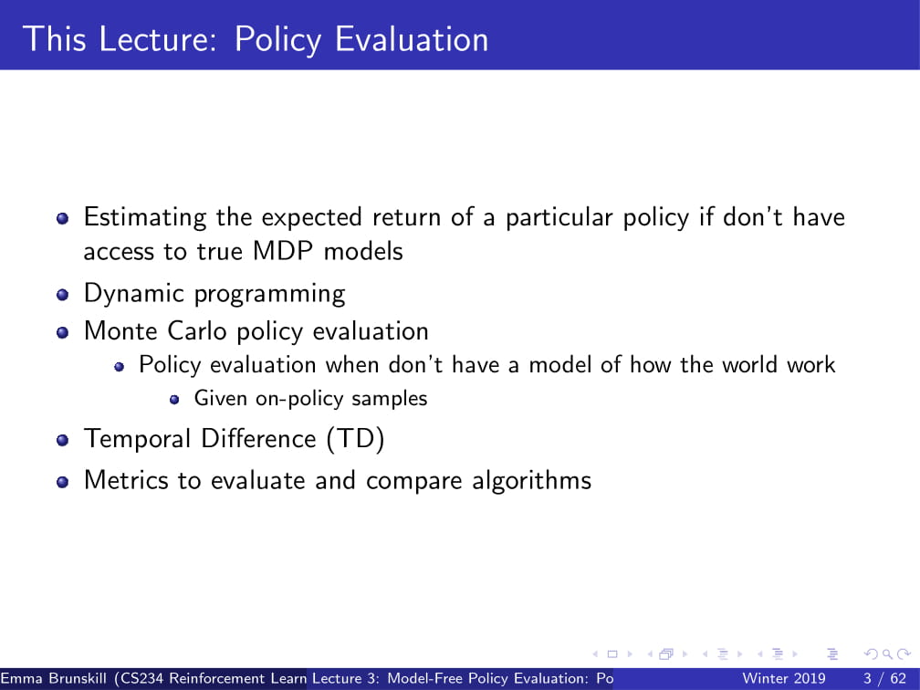 CS234 3강에선, MDP 모델 없이 Policy Evaluation하는 법에 대해 다룬다.
