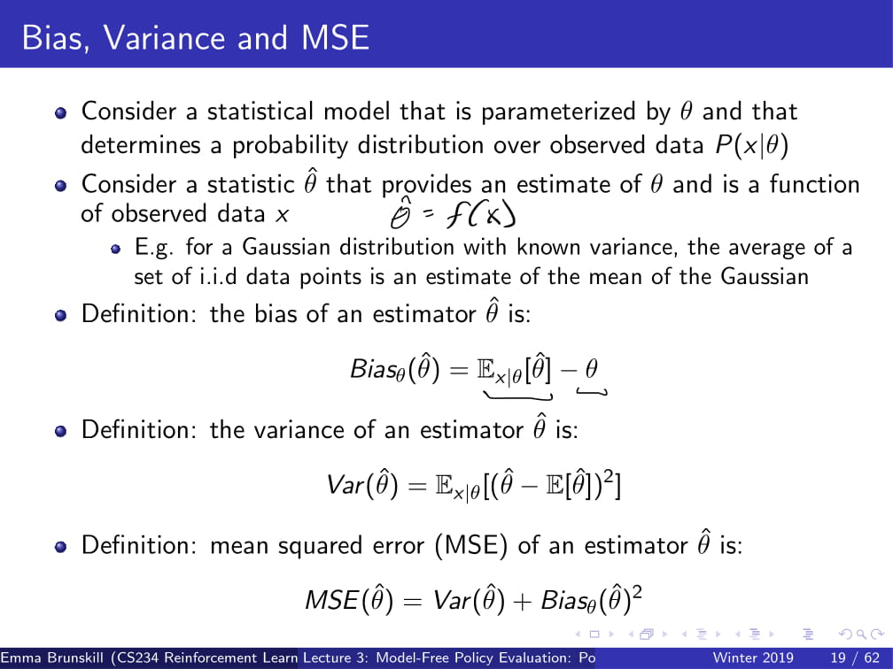 Vπ의 estimator θ^은, unbiased(bias가 없는) 실제 [Gt|st = s]의 기댓값이다.