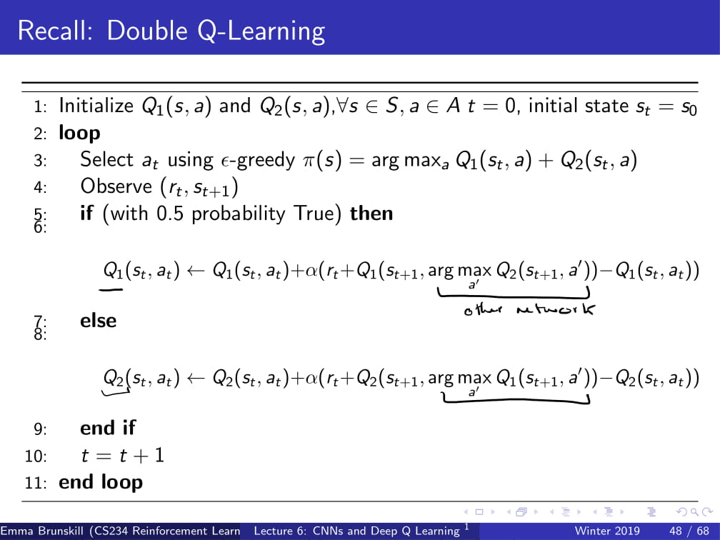 Q를 하나만 쓰는 대신, 두 개를 사용하여 50% 확률로 Q1, 나머지 50% 확률로 Q2를 사용하여 Q-learning을 하는 방식이었다.