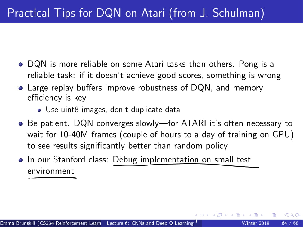 - DQN은 다른 방식들보다는 더 믿을만한 방법이다. Pong은 그중에서도 좀 믿음직 스러운 게임인데, 만약 DQN을 Pong에 적용시켰는데 뭔가 잘 안된다면, 너가 뭔가 잘못 한 것이다.