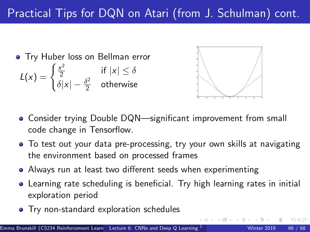 - Bellman error에서 Huber loss를 시도해 보아라. (위 식 참고)