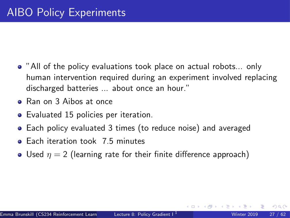 그리고 이 AIBO의 성능은 초기 starting policy parameter, ε (더하고 빼지던 정도), α (learning rate), 그리고 policy parameterization 등이 영향을 미쳤다고 한다.
